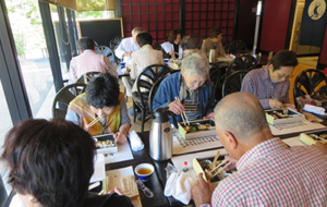 白檀一木造の本山の千手観音様をお参りした後、美しい弁天池を眺めながらの昼食です。